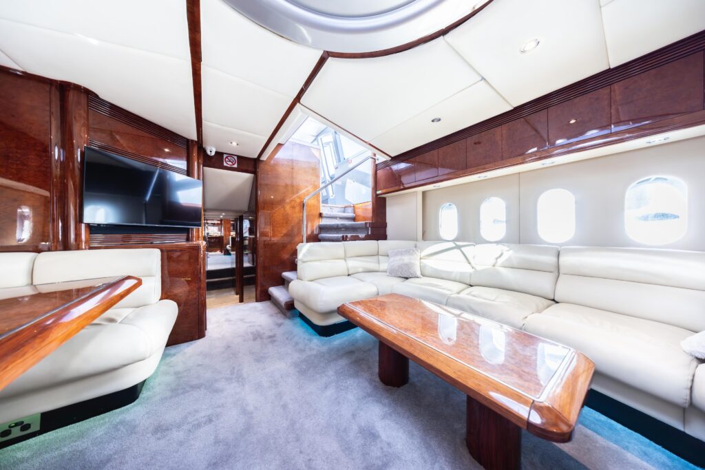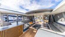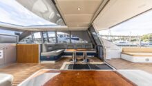 Inside, light pours through a retractable sunroof, illuminating a beautifully appointed interior where comfort meets contemporary sophistication. The open back deck sets the scene for lively conversations under the sun, while the air-conditioned lounge below offers a quiet, intimate sanctuary—perfect for a quiet chat or to set the kids to watch some TV and play on their own.